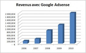 J’ai fais à peu près la même progression de 2006 à 2009 en passant de 0 à 10000€/an puis en réduisant le rythme, car c’est du boulot, je suis descendu d’environ 30% mais cela me suffit largement car j’ai diminué mon temps sur mes blogs de 80%.