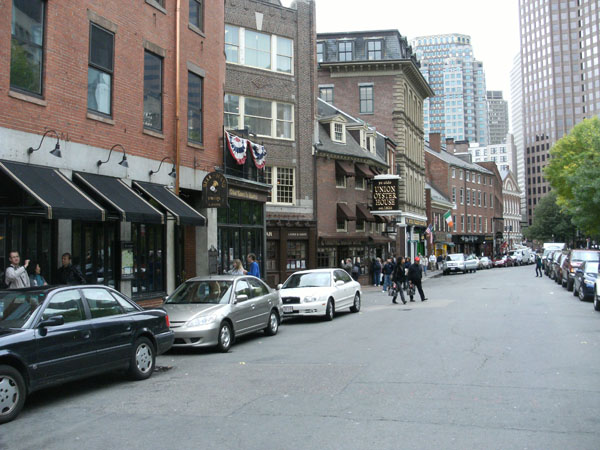 Premier plan: vieux Boston. Second plan: gratte-ciels modernes. En avant plan, on distingue le Bell Hand Tavern, second bar le plus vieux des tous les USA (fondé en 1795)