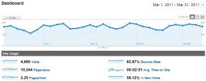 Bonjour à toutes et à tous. Après 4 mois de bloguing, après le bilan du mois de décembre 2010 celui de janvier 2011 et de février 2011, place au bilan du mois de mars. Bien que le bilan soit un peu mitigé pour mars, il demeure tout de même positif ne mérite absolument pas que j’abandonne mon blog, comme je l’évoquais dans l’article d’hier « Savoir reconnaître ses échecs » publié hier, et qui n’était qu’un poisson d’avril.