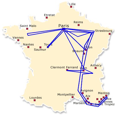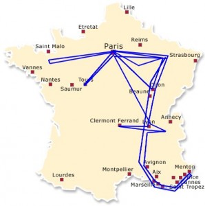 A la fin de mes 2 ans de classe préparatoire, j’ai passé les oraux d’école de commerce dans les villes suivantes : Troyes, Dijon, Strasbourg, Paris, Rennes, Tours, Clermont-Ferrand, Chambéry. En bleu, les trajets de train que j’ai acheté dans le cadre de mon tour de france.