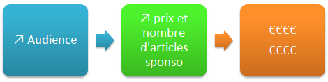 Le chiffre en soi ne veut rien dire car les articles sponsorisés ne sont pas toujours corrélés avec l’audience et donc attirer plus de monde sur votre blog n’augmentera pas nécessairement les revenus tirés avec votre blog. Mais une chose est sûre : plus d’audience signifie plus de popularité de son blog, donc plus de « like », de « retwitte » et donc un meilleur référencement, donc encore plus d’audience. Et plus vous avez d’audience et un bon référencement, plus vous intéressez les annonceurs pour placer sur votre blog un article sponsorisé. Résumons :