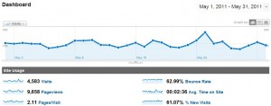 – 24 articles postés (Avril: 23). Comme je l’évoquais dans mon bilan d’avril 2011, mon but est de ralentir le rythme de publication de mes articles pour avoir davantage de temps de promouvoir le blog. Le but original est de 1 article tous les 2 jours, un objectif non-atteint, en raison de ma volonté de continuer à promouvoir le blog (longue-traîne…) avec de nouveaux articles, et la publication d’un certain nombre d’articles sponsorisés et d’articles invités. Pour la première fois depuis l’histoire du blog, le nombre d’articles publiés à augmenté d’un mois sur l’autre.