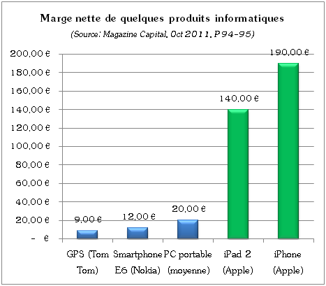 Apple : c’est 28% de marge nette, 41% de marge brute. Apple gagne autant en vendant un téléphone ou une tablette que ses concurrents n’en gagnent en vendant 10 produits…