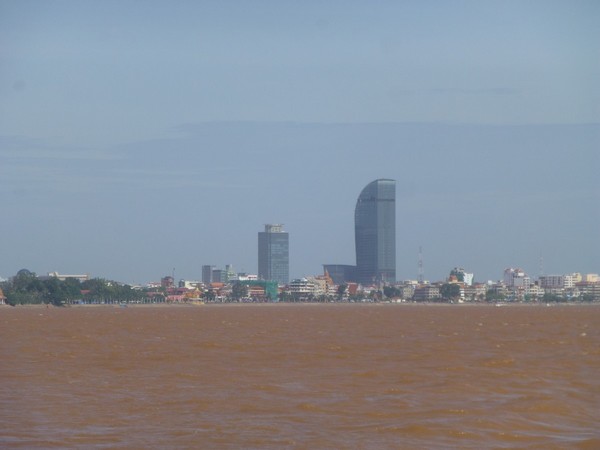 Phnom Penh vu depuis un bateau rapide circulant sur le Mékong